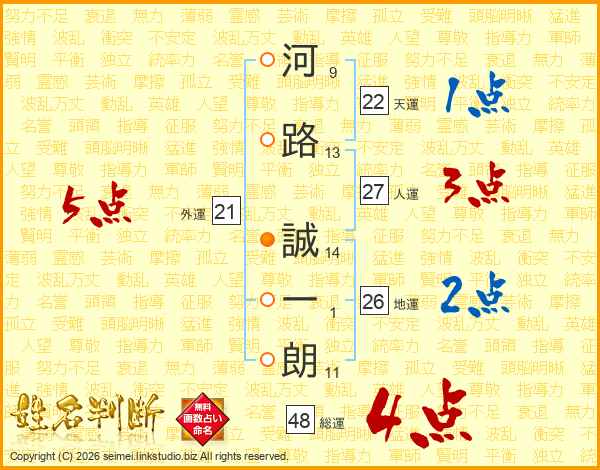 河(9画)路(13画) 誠(14画)一(1画)朗(11画)