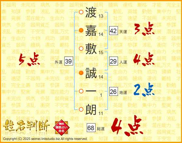 渡(13画)嘉(14画)敷(15画) 誠(14画)一(1画)朗(11画)