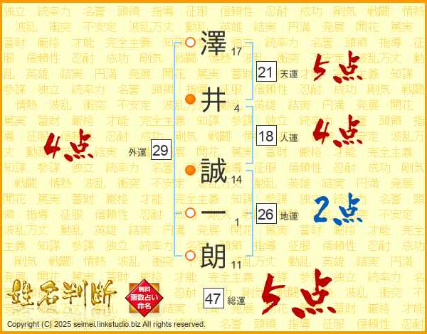 澤(17画)井(4画) 誠(14画)一(1画)朗(11画)