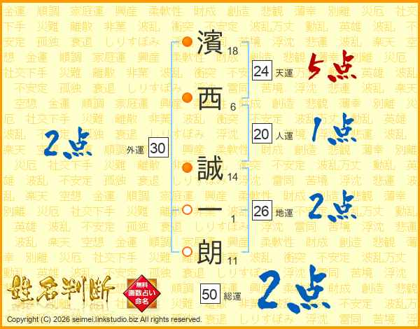濱(18画)西(6画) 誠(14画)一(1画)朗(11画)