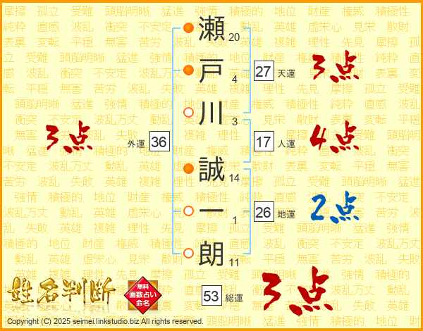 瀬(20画)戸(4画)川(3画) 誠(14画)一(1画)朗(11画)