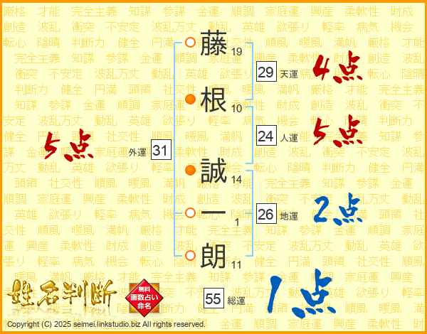 藤(19画)根(10画) 誠(14画)一(1画)朗(11画)