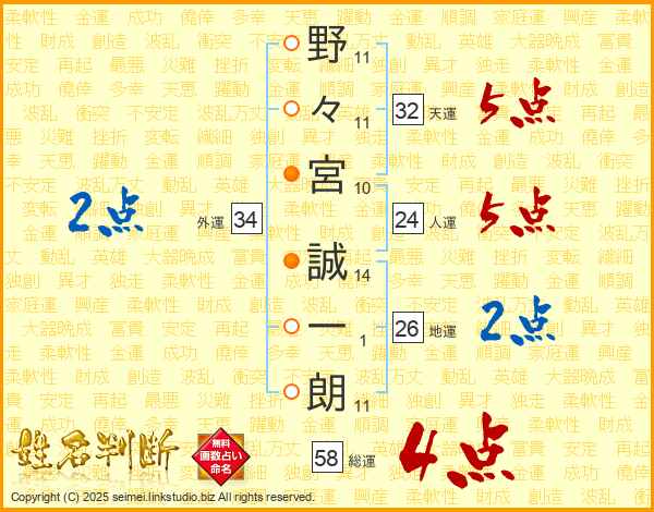 野(11画)々(11画)宮(10画) 誠(14画)一(1画)朗(11画)