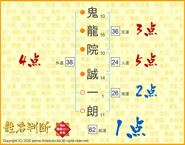 鬼(10画)龍(16画)院(10画) 誠(14画)一(1画)朗(11画)
