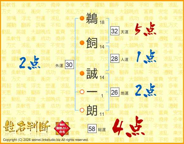 鵜(18画)飼(14画) 誠(14画)一(1画)朗(11画)