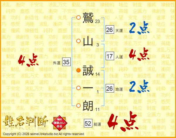 鷲(23画)山(3画) 誠(14画)一(1画)朗(11画)