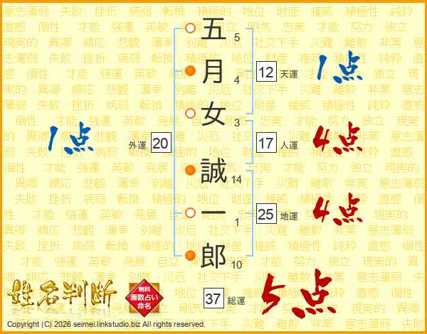 五(5画)月(4画)女(3画) 誠(14画)一(1画)郎(10画)
