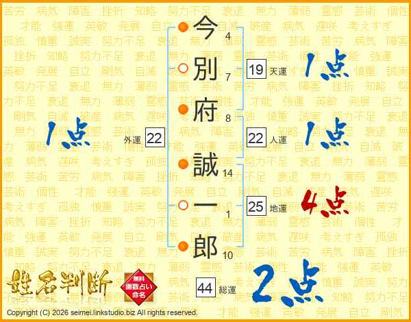 今(4画)別(7画)府(8画) 誠(14画)一(1画)郎(10画)