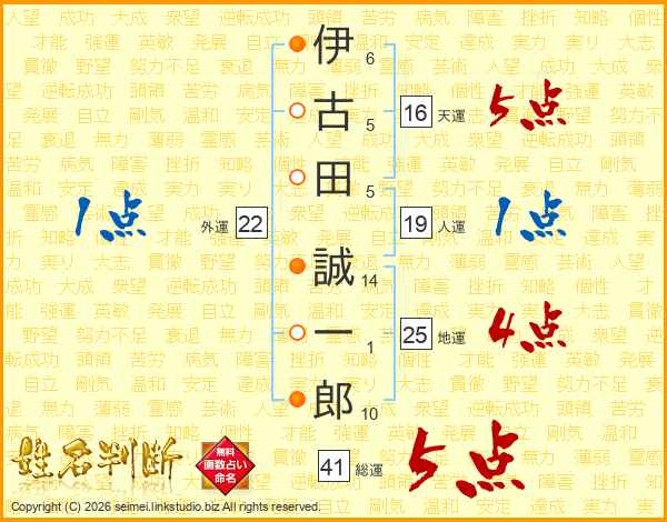 伊(6画)古(5画)田(5画) 誠(14画)一(1画)郎(10画)