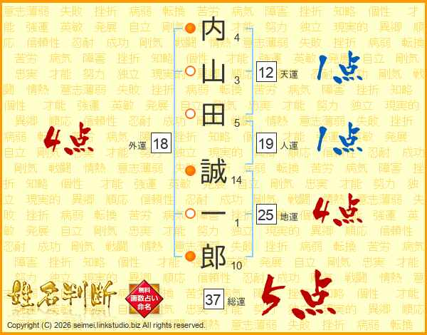 内(4画)山(3画)田(5画) 誠(14画)一(1画)郎(10画)