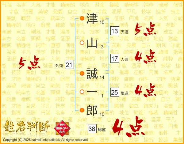 津(10画)山(3画) 誠(14画)一(1画)郎(10画)