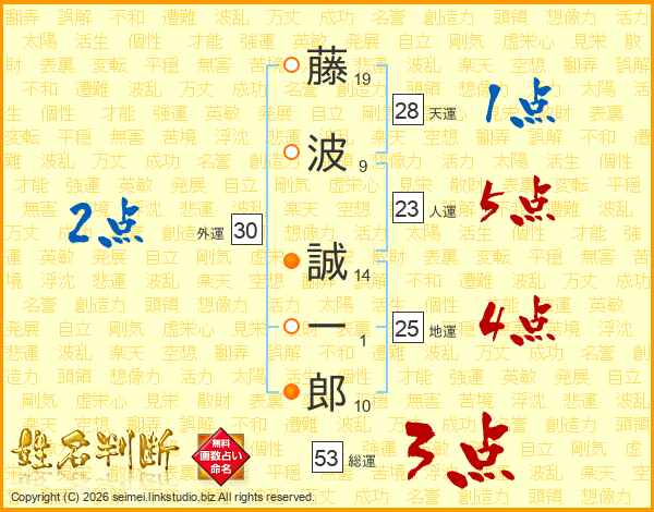 藤(19画)波(9画) 誠(14画)一(1画)郎(10画)