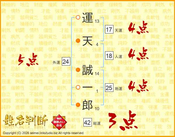 運(13画)天(4画) 誠(14画)一(1画)郎(10画)