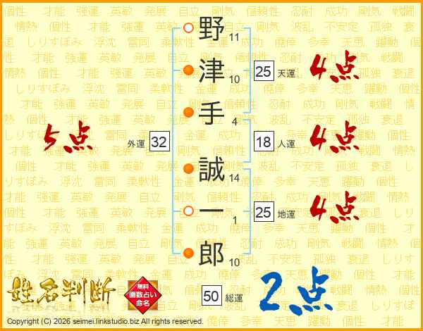 野(11画)津(10画)手(4画) 誠(14画)一(1画)郎(10画)