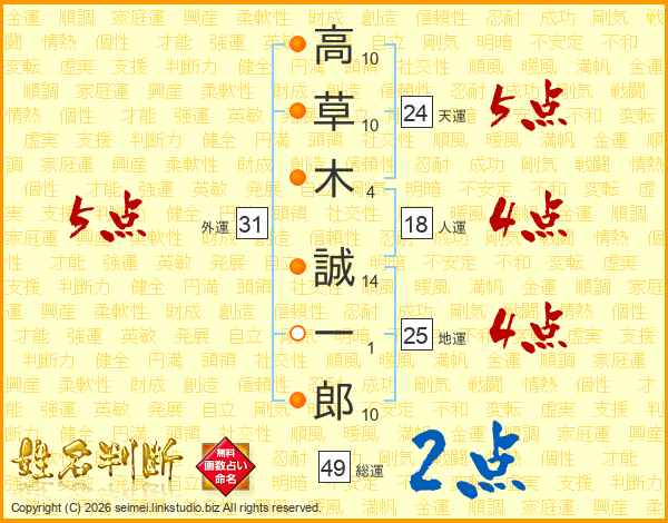 高(10画)草(10画)木(4画) 誠(14画)一(1画)郎(10画)