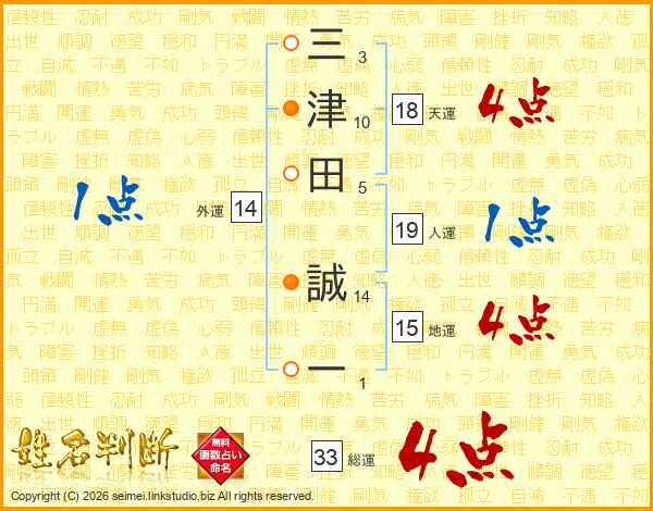 三(3画)津(10画)田(5画) 誠(14画)一(1画)