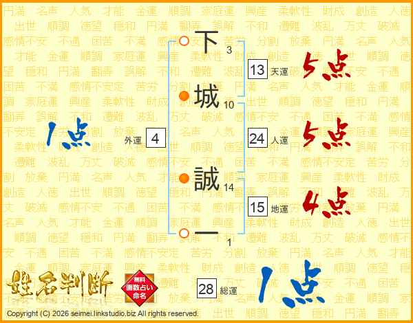 生活面を象徴する運勢です。外部から受ける影響力を表し、結婚運、家庭運や職場、環境への順応性を表します。総運から人運を引いた画数。姓や名が1文字の場合を除く。