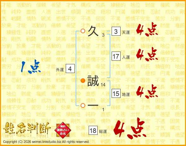 生活面を象徴する運勢です。外部から受ける影響力を表し、結婚運、家庭運や職場、環境への順応性を表します。総運から人運を引いた画数。姓や名が1文字の場合を除く。