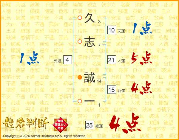 生活面を象徴する運勢です。外部から受ける影響力を表し、結婚運、家庭運や職場、環境への順応性を表します。総運から人運を引いた画数。姓や名が1文字の場合を除く。