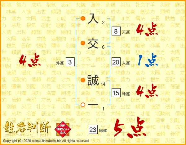 生活面を象徴する運勢です。外部から受ける影響力を表し、結婚運、家庭運や職場、環境への順応性を表します。総運から人運を引いた画数。姓や名が1文字の場合を除く。