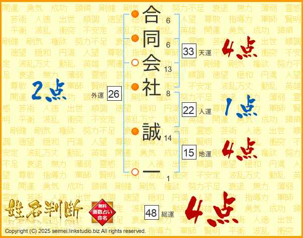 合(6画)同(6画)会(13画)社(8画) 誠(14画)一(1画)