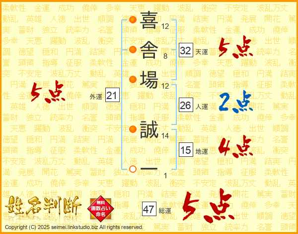 喜(12画)舎(8画)場(12画) 誠(14画)一(1画)