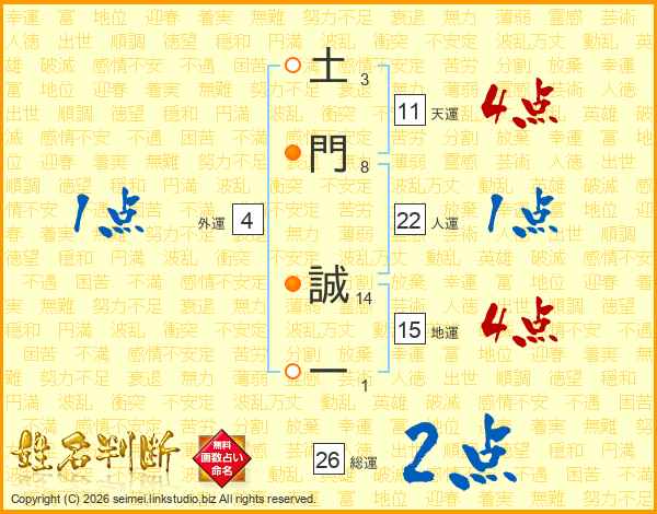 土(3画)門(8画) 誠(14画)一(1画)