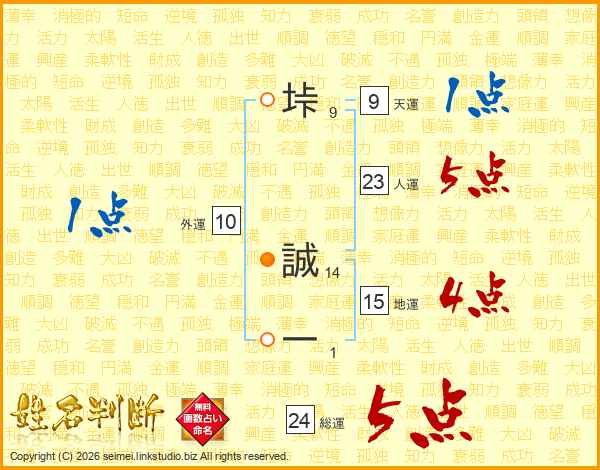 生活面を象徴する運勢です。外部から受ける影響力を表し、結婚運、家庭運や職場、環境への順応性を表します。総運から人運を引いた画数。姓や名が1文字の場合を除く。