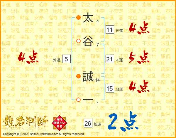 あなたの人生を表す1番重要な運勢です。生涯を通じて影響する総合運となり、主に50歳以降の晩年期に影響を及ぼします。苗字と名前の合計画数。