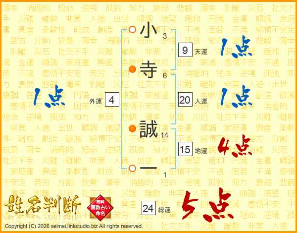 生活面を象徴する運勢です。外部から受ける影響力を表し、結婚運、家庭運や職場、環境への順応性を表します。総運から人運を引いた画数。姓や名が1文字の場合を除く。