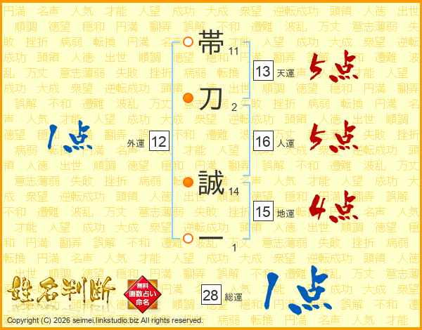 帯(11画)刀(2画) 誠(14画)一(1画)