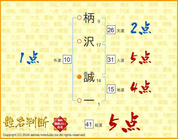 柄(9画)沢(17画) 誠(14画)一(1画)