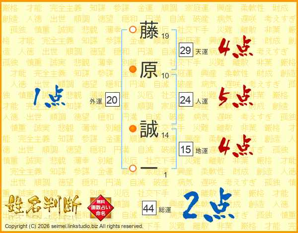 あなたの人生を表す1番重要な運勢です。生涯を通じて影響する総合運となり、主に50歳以降の晩年期に影響を及ぼします。苗字と名前の合計画数。
