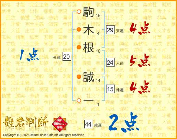 駒(15画)木(4画)根(10画) 誠(14画)一(1画)