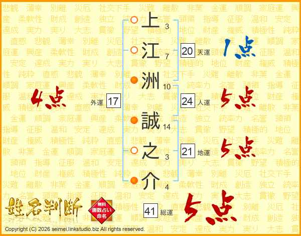 上(3画)江(7画)洲(10画) 誠(14画)之(3画)介(4画)