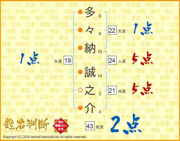 多(6画)々(6画)納(10画) 誠(14画)之(3画)介(4画)