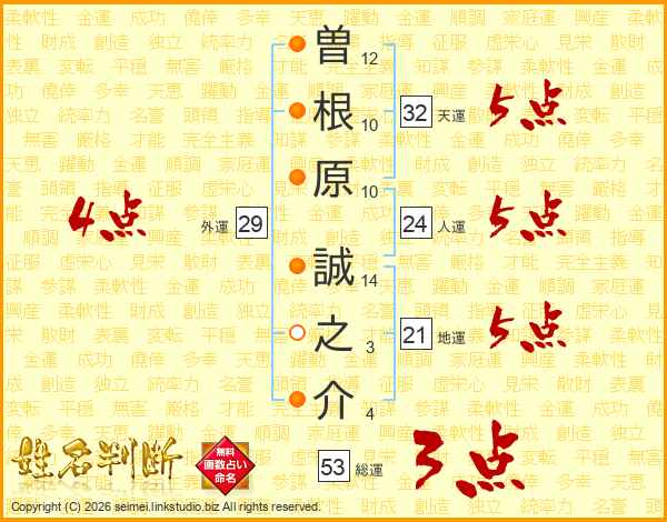 曽(12画)根(10画)原(10画) 誠(14画)之(3画)介(4画)