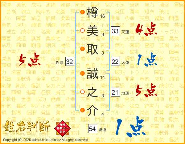 樽(16画)美(9画)取(8画) 誠(14画)之(3画)介(4画)
