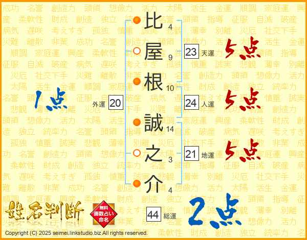 比(4画)屋(9画)根(10画) 誠(14画)之(3画)介(4画)