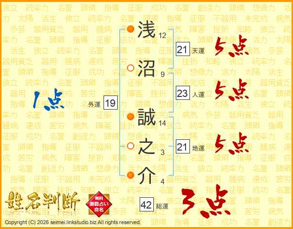 浅(12画)沼(9画) 誠(14画)之(3画)介(4画)