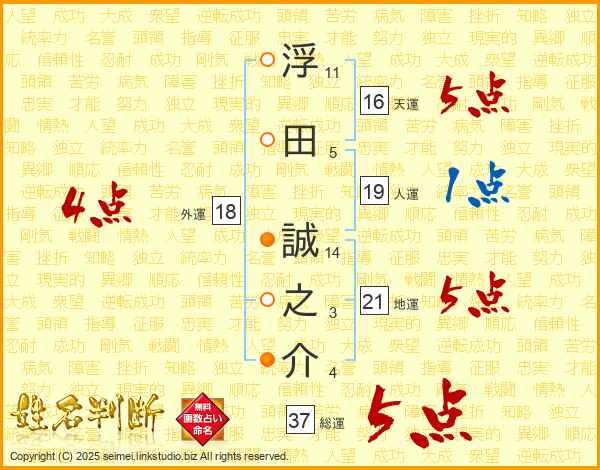 浮田誠之介さんの総運は37画の5点!