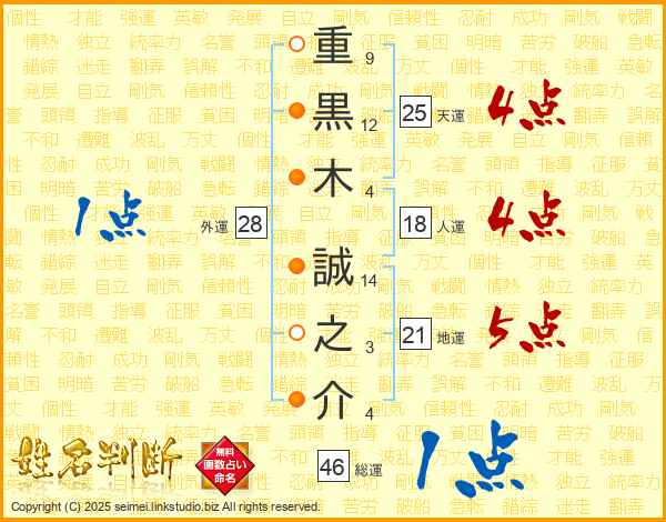 重(9画)黒(12画)木(4画) 誠(14画)之(3画)介(4画)