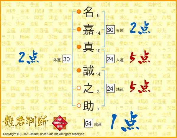 名(6画)嘉(14画)真(10画) 誠(14画)之(3画)助(7画)