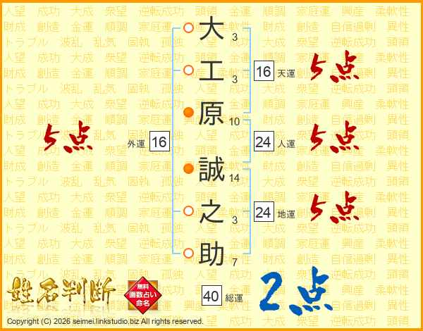 大(3画)工(3画)原(10画) 誠(14画)之(3画)助(7画)