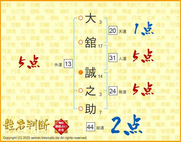 大(3画)舘(17画) 誠(14画)之(3画)助(7画)
