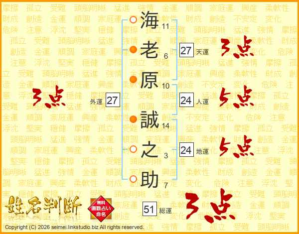 海(11画)老(6画)原(10画) 誠(14画)之(3画)助(7画)
