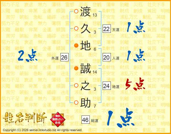 渡(13画)久(3画)地(6画) 誠(14画)之(3画)助(7画)