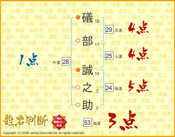 礒(18画)部(11画) 誠(14画)之(3画)助(7画)