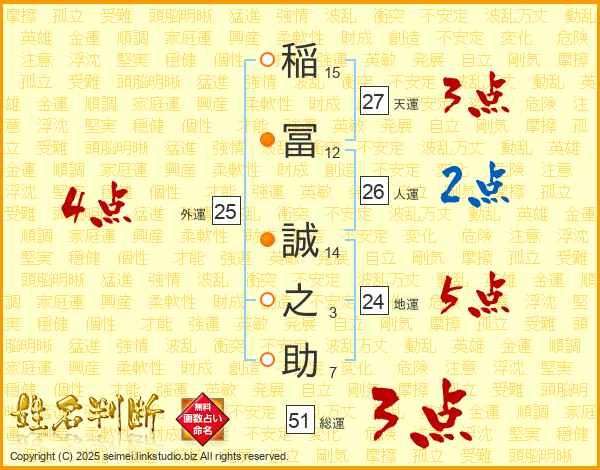 稲(15画)冨(12画) 誠(14画)之(3画)助(7画)