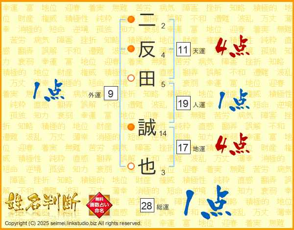 二(2画)反(4画)田(5画) 誠(14画)也(3画)
